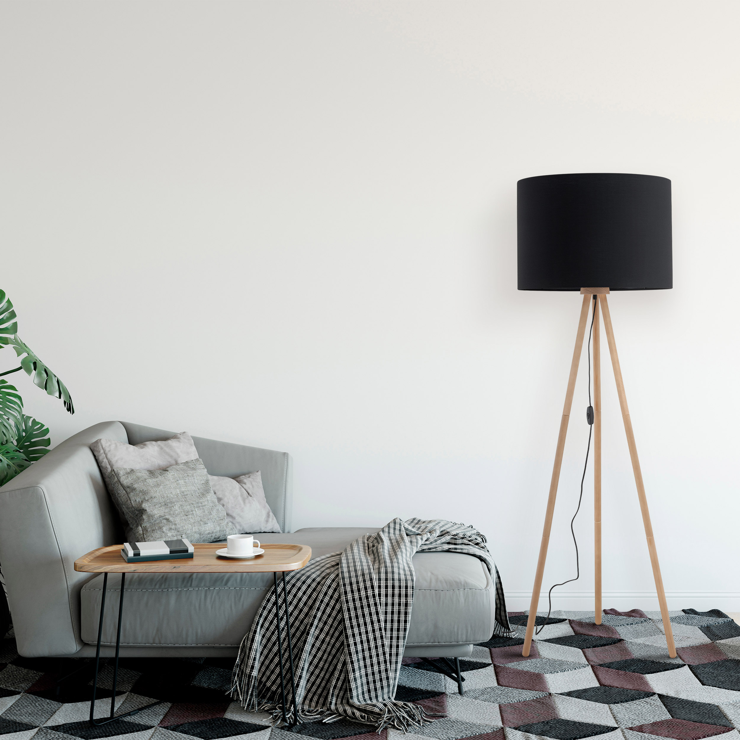 En stock Livraison 4 à 7 joursAccent chaleureux : abat-jour noir et support en pin et noir structurent le salon ou la chambre.