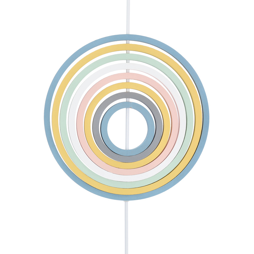 Cette suspension Hoops avec ses 8 anneaux colorés en bois MDF est un luminaire ludique et original parfait pour une chambre d’enfant ou d’adolescent. Montée sur un câble blanc avec une douille E27, elle offre la possibilité d’utiliser des sources lumineuses traditionnelles ou LED.