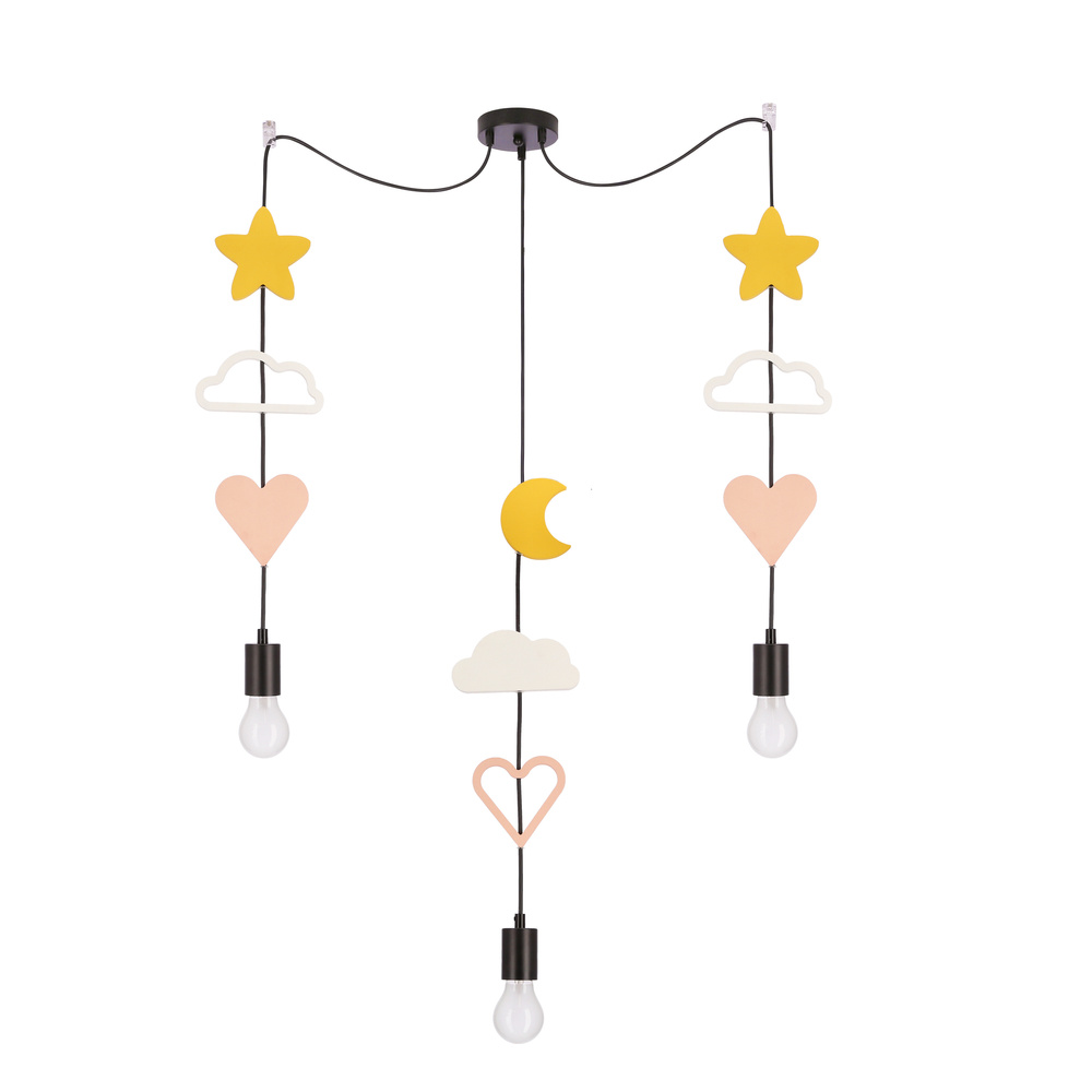 Suspension triple de la série TRIO par , décorée d’étoiles jaunes, de cœurs roses et de lunes dorées. Ce luminaire suspendu au design enchanteur crée un univers magique dans la chambre de votre enfant.