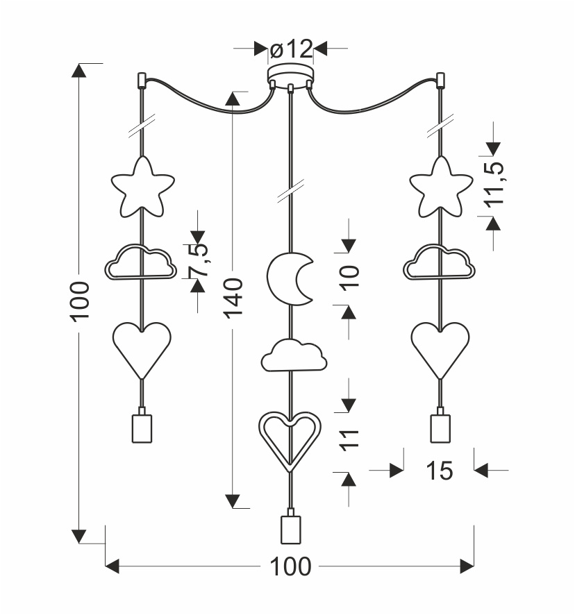 Construite avec des câbles en acier noir et des éléments décoratifs en MDF aux formes d’étoiles, cœurs et lunes, elle combine solidité et fantaisie. Dimensions : 100 cm de largeur, 15 cm de profondeur et 100 cm de hauteur.